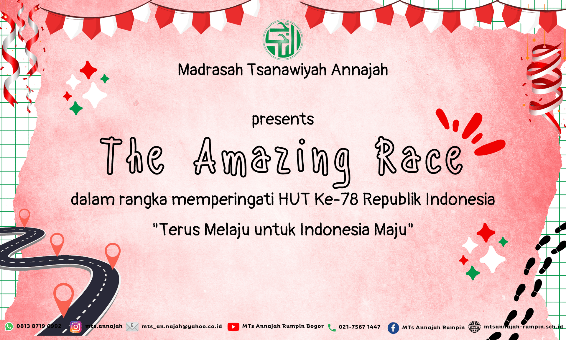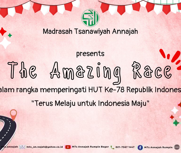 Terima Kasih untuk Semua Peserta! MTs Annajah mengucapkan terima kasih kepada seluruh guru dan siswa yang telah mengikuti dan membantu terlaksananya kegiatan "The Amazing Race", sehingga menjadi peristiwa yang luar biasa. Semangat kebersamaan dan semangat nasionalisme yang kalian tunjukkan adalah inspirasi bagi kita semua. Mari terus merajut kisah sukses dan prestasi dalam semangat cinta tanah air!